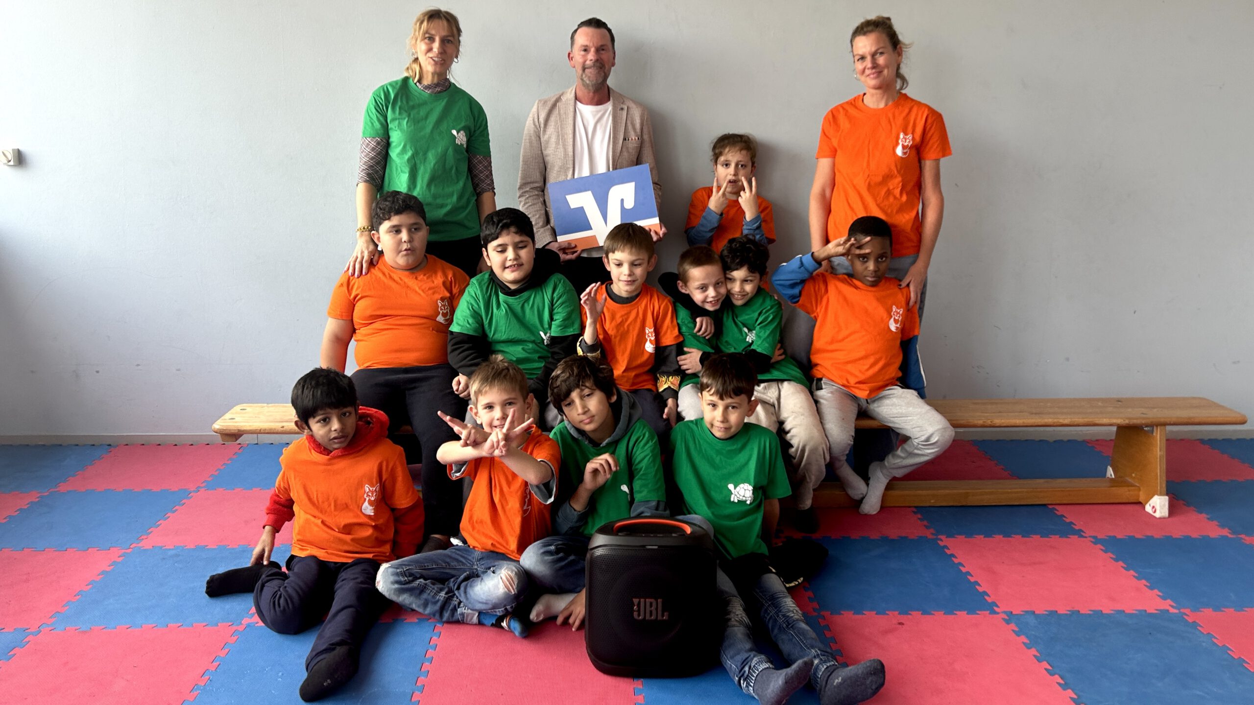 Damit das Training und der Auftritt zu einem echten Gemeinschaftserlebnis werden konnten, haben wir das Förderzentrum gerne unterstützt. Für das Üben erhielten die Kinder eine Musikbox, mit der sie ihre Tänze einstudieren konnten. Zusätzlich gab es einheitliche T-Shirts in leuchtendem Orange und Grün, jeweils mit einem Fuchs- oder Schildkröten-Logo bedruckt – passend zu den Klassentieren. So konnten alle sichtbar als Team auftreten und ihr Zusammengehörigkeitsgefühl stärken.