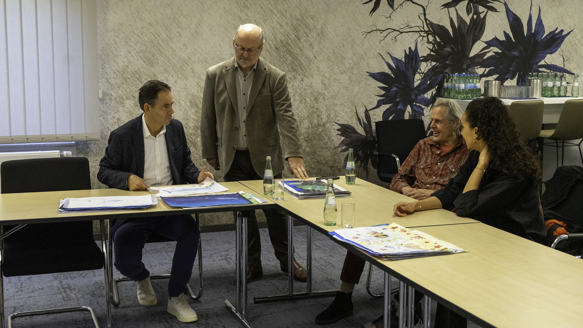 Künstler Uwe Peters und Emil Schult mit Sinaida Ropte, Künstlerin in Ausbildung, und Michael Willemse, Vorstand der Volksbank Viersen, haben die Jurierung des 56. Jugendwettbewerbs durchgeführt.