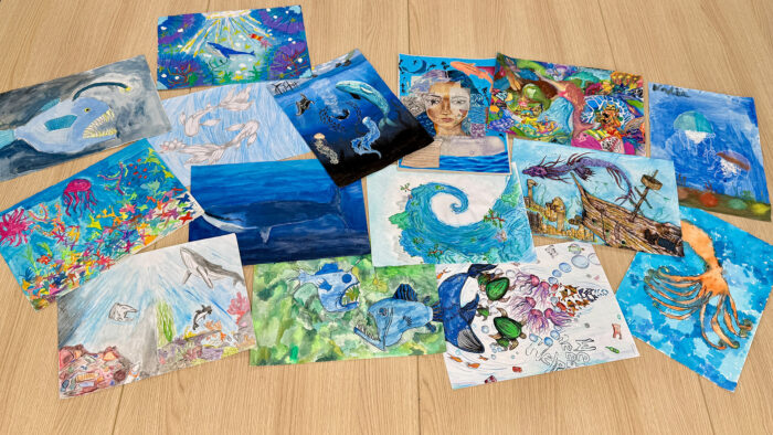 Die eingereichten Werke zeigen eindrucksvoll, wie vielseitig das Motto „Meer entdecken“ interpretiert wurde. Von farbenfrohen Unterwasserwelten mit Korallenriffen und exotischen Fischen über nachdenkliche Darstellungen von Umweltverschmutzung bis hin zu fantasievollen Meereswesen – die jungen Künstlerinnen und Künstler haben ihrer Kreativität freien Lauf gelassen.