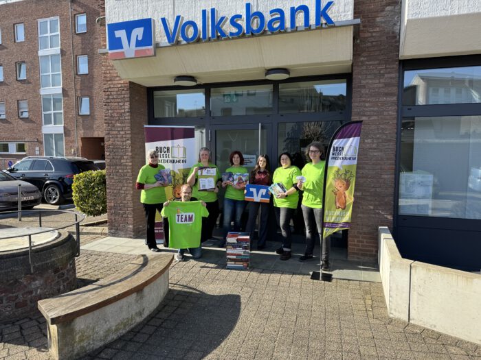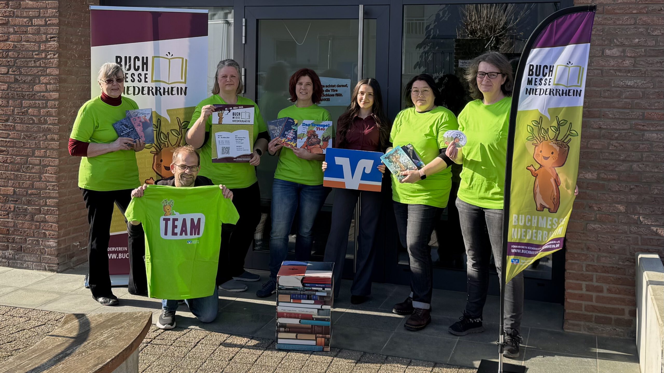 Das Team des Fördervereins Bücherregen freut sich auf die Buchmesse! Von links nach rechts: Marita Kürschner (PR und Gründungsmitglied), Michael Karius (Helfer der Buchmesse), Nadine Reitz (Illustratorin und Gründungsmitglied), Diana Menschig (Autorin und Gründungsmitglied), Jessica Bove (Privatkundenberaterin der Volksbank Viersen), Michaela Weise (Gründungsmitglied) und Melanie Karius (Helferin der Buchmesse).