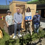 Von links: Katharina Löhrer (Fachberaterin), Marcel Hartwig (Vorsitzender KGV Eichenbrunnen e.V.), Sabine Reuter (Leiterin der Geschäftsstelle Viersen), Klaus Baber-Opdenbusch (2. Vorsitzender) und Klaus Haschke (Beisitzer) vor der Komposttoilette und dem Komposter im KGV Eichenbrunnen.